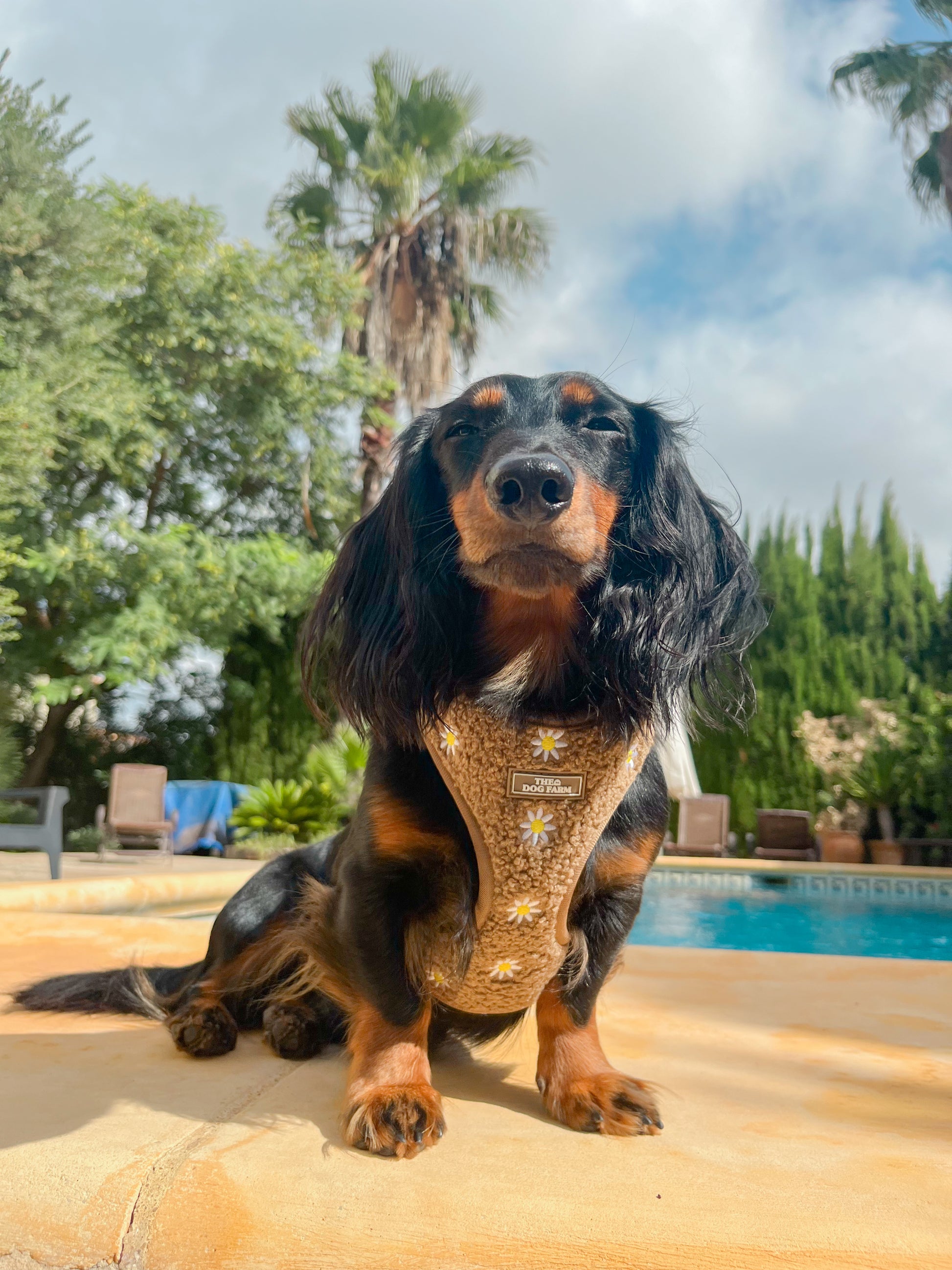 Het model op foto 1 is een langharige Teckel van 2 jaar oud. Hij weegt 6 kilo en draagt een S.