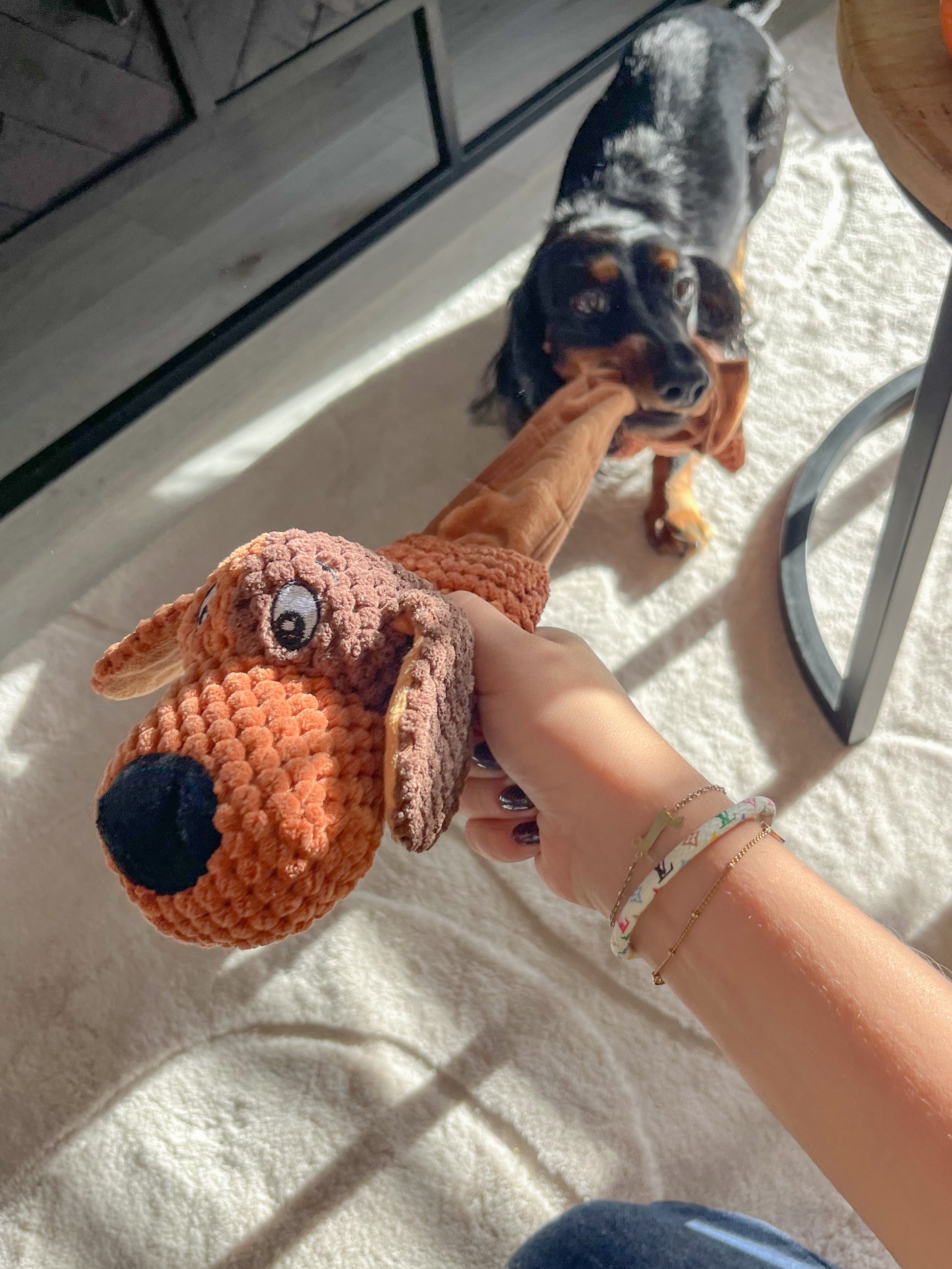 Deze schattige teckel ziet er niet alleen onweerstaanbaar uit, maar zorgt ook voor uren speelplezier.